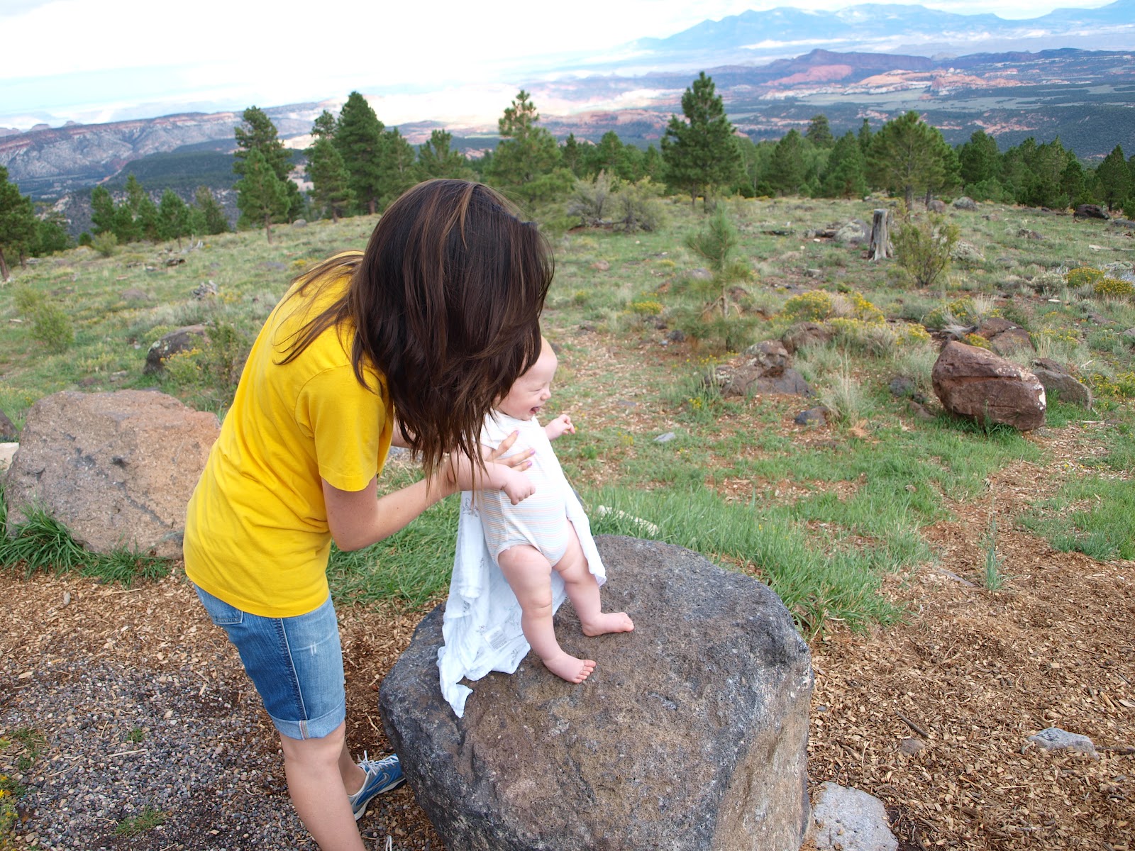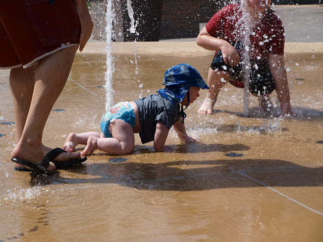 He crawls. And climbs. One day dad decided to show him how to pull himself up on the couch, and now he's pulling up on the couch, on the chair, on the kitchen drawers, on the bathtub, on the bedcovers-you name it, he's probably pulled himself up on it. He especially loves the up and over trick. He'll pull up on his tub full of toys, then try to launch himself over it. Or the the other day he pulled up on the tub side, then dove straight into the tub! Luckily he's figuring out how to catch himself with his arms, but we still have a heart-stopping, face-planting moment about once everyday.